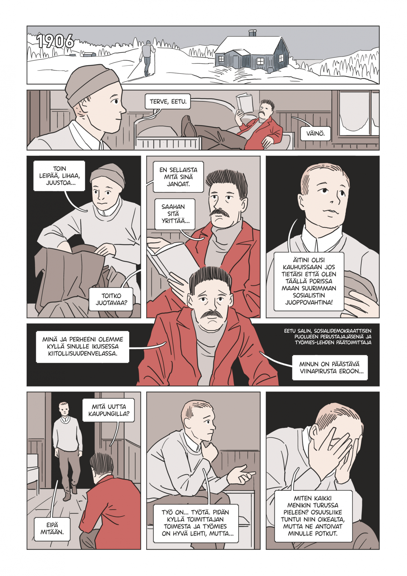 Tammikuussa 1907, siis ennen vaaleja, väsähti Eetu Salin ja vaati minua kanssaan Kyläsaaressa olevaan mökkiinsä, jossa hänen oli tarkoitus saattaa Itsensä kuntoon. Läksimmekin mökille ja siellä alettiin mitä reippainta elämää. Aamulla aloitettiin päivä kunnollisella aamuvoimistelulla, sitten mentiin pakkasista huolimatta ilkialastomina ulos ja kaadettiin sangosta pari sangollista kaivovettä niskaamme ja kaupanpäällisiksi piehtaroitiin lumessa. Tämä ei ehkä tunnu aivan uskottavalta - ei ehkä niin paljon minuun nähden, joka olin vielä nuori, mutta siitä huolimatta sain naapureilta "hullun maisterin" nimen - mutta Salinista sitä tuskin leukaan haluaa todesta ottaa. Vakuutan kuitenkin meidän eläneen koko tammikuun tällä tavalla, onpa minulla siitä vielä tallella valokuvakin todistuskappaleena. Sen jälkeen käytettiin päivä lukemiseen, vaalikirjoitusten laatimiseen ja shakinpeluuseen. Tietysti ylläpidettiin myös valistavaa ja henkevää keskustelua, kun työ ei enää maittanut. Se oli rauhallisin vaalikausi, mitä minulla koskaan on ollut.