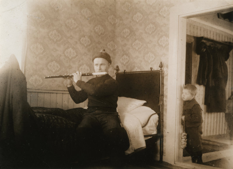 Väinö Eetu Salinin mökillä alkuvuodesta 1907. Salinien kasvattilapsi Kalle kuuntelee tarkasti, kun Väinö soittaa poikkihuilua. Työväen Arkisto.