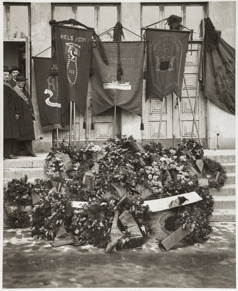 Eetu Salinin avoin arkku Helsingin Työväentalon pihalla. Salin tuomittiin Suomen sisällissodan jälkeen alkuun kuolemaan ja sittemmin kymmeneksi vuodeksi kuritushuoneeseen osallistumisesta punaisten hallinnon eli Suomen Kansanvaltuuskunnan toimintaan. Salin kuoli vuonna 1919 Sörnäisten vankilassa. Kuva: Eric Sundström. Työväen Arkisto.