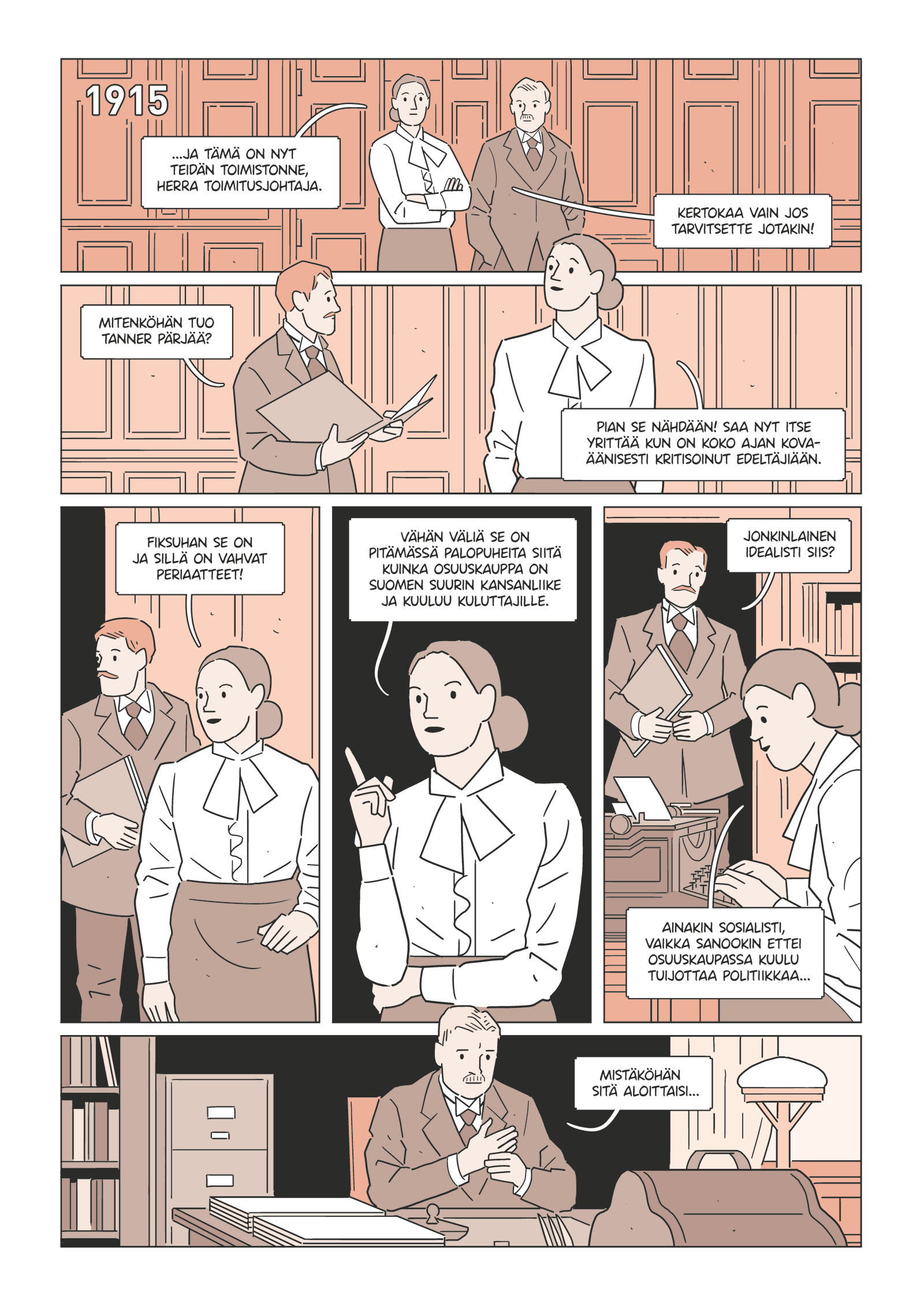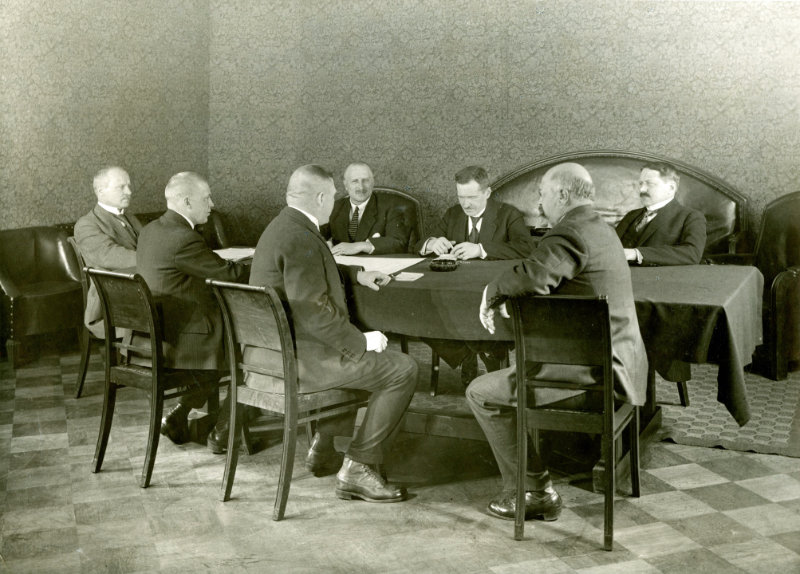Elannon johtokunta kokoustaa vuonna 1922. Väinö vasemmalla pöydän päässä. Työväen Arkisto.