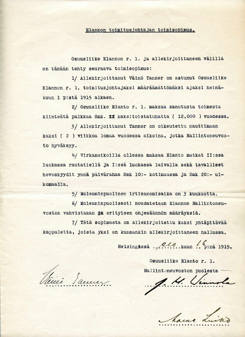 Väinön 16.8.1915 allekirjoittama Osuusliike Elannon toimitusjohtajan työsopimus. Työväen Arkisto.