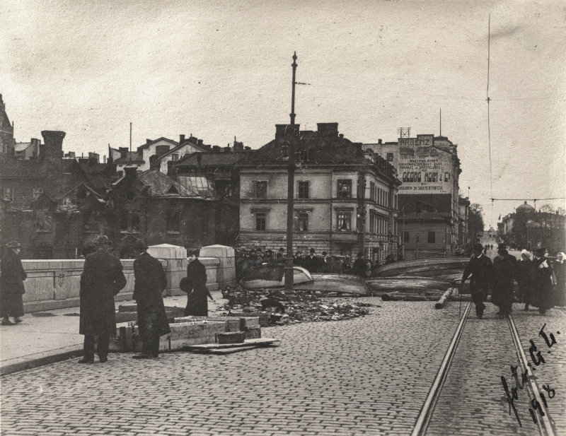 Punaisten hallitus eli Suomen kansanvaltuuskunta hallitsi Helsinkiä sisällissodan alusta aina huhtikuun 1918 alkuun. Kuvassa näkyy Helsingin Kauppatoria kansanvaltuuskunnan hallinnon aikana. Vasemmalla marssii aseistettu punakaartilaispartio, kuvan etualalla on nuori nainen. Taustalla näkyy Tuomiokirkko. Työväen Arkisto.