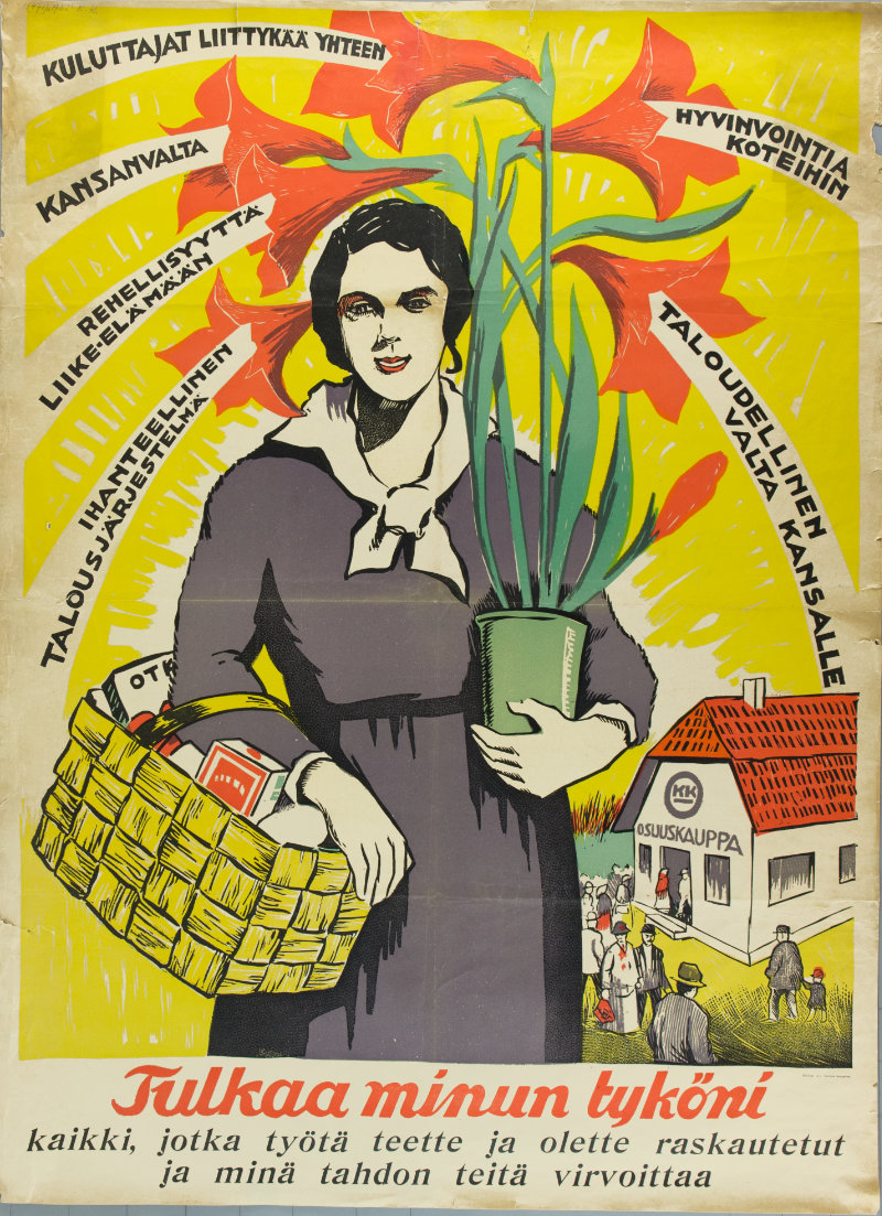 Kuluttajat liittykää yhteen. Kulutusosuuskuntien Keskusliiton mainososaston vuonna 1923 valmistama juliste valistaa kuluttajia osuustoiminnan tarpeellisuudesta. Mainosjulisteita ripustettiin mm. myymälöiden seinille. Työväen Arkisto.