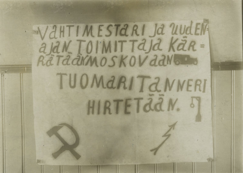 Vihapuhe oli voimissaan 1930-luvulla, ja Väinökin sai siitä osansa. Kuvassa Panelian työväenyhdistyksen ulko-ovelle syyskuussa 1931 naulattu plakaatti. Työväen Arkisto.