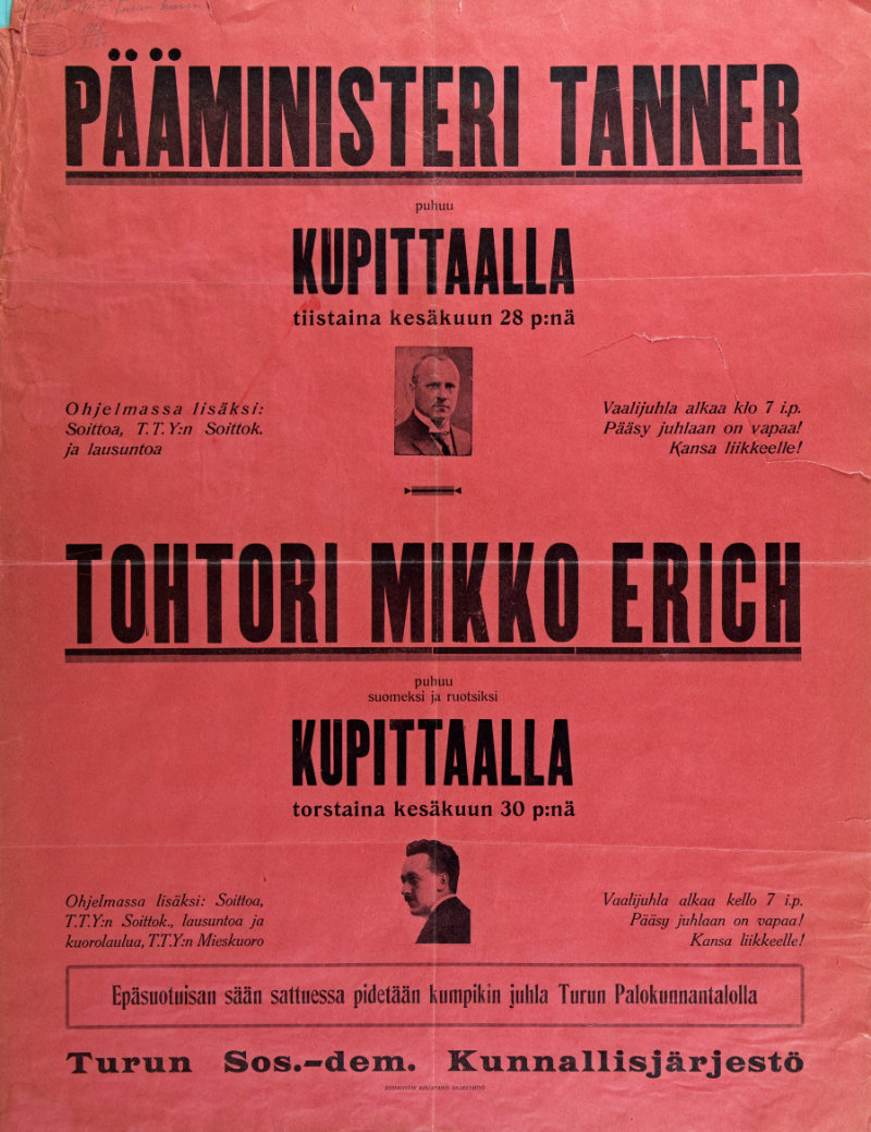 Pääministeri Tanner Kupittaalla. Turussa kesäkuussa 1927 pidettävien eduskuntavaalijuhlien mainosjuliste. Valmistaja Sosialistin Kirjapaino Osakeyhtiö 1927. Työväen Arkisto.