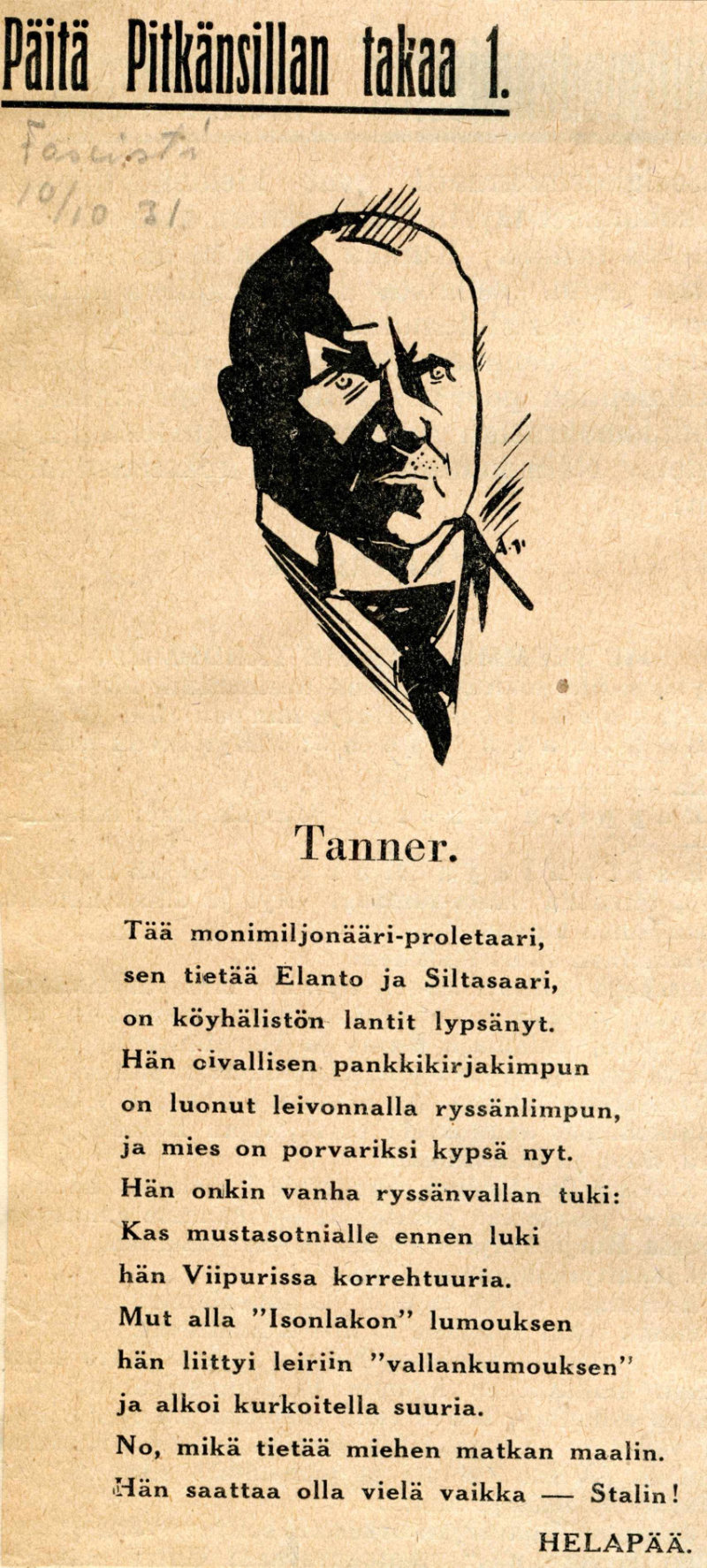Väinö ei miellyttänyt äärioikeistoa. Samaisena vuonna 1931 Fascisti-lehdessä julkaistiin “Helapään” kirjoittama pilkkaruno Väinöstä. Työväen Arkisto.