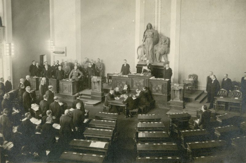 Ennen eduskuntatalon valmistumista eduskunta kokoontui alkuun Helsingin VPK:n talossa nykyisellä Keskuskadulla ja sittemmin Heimolan talossa nykyisellä Yliopistonkadulla. Kuvassa eduskunnan ensimmäinen istunto sisällissodan päättymisen jälkeen 15.5.1918 Heimolan talossa. Vasemmiston edustajista oli paikalla ainoana Matti Paasivuori, joka oli sanoutunut irti aseellisesta kapinasta. Kuva: Foto Nyblin. Työväen Arkisto.