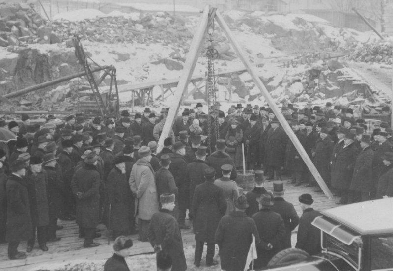 Ministeri Wäinö Wuolijoki lukemassa perustuskirjaa uuden Eduskuntatalon peruskiven muuraustilaisuudessa 2.4.1927. Työväen Arkisto.