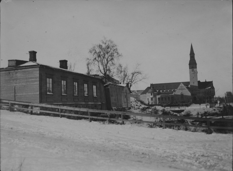 Tulevan eduskuntatalon rakennuspaikalla puutalo Villa Hammarbärg. Taustalla Kansallismuseo. Kuvattu 1916–1926. Työväen Arkisto.