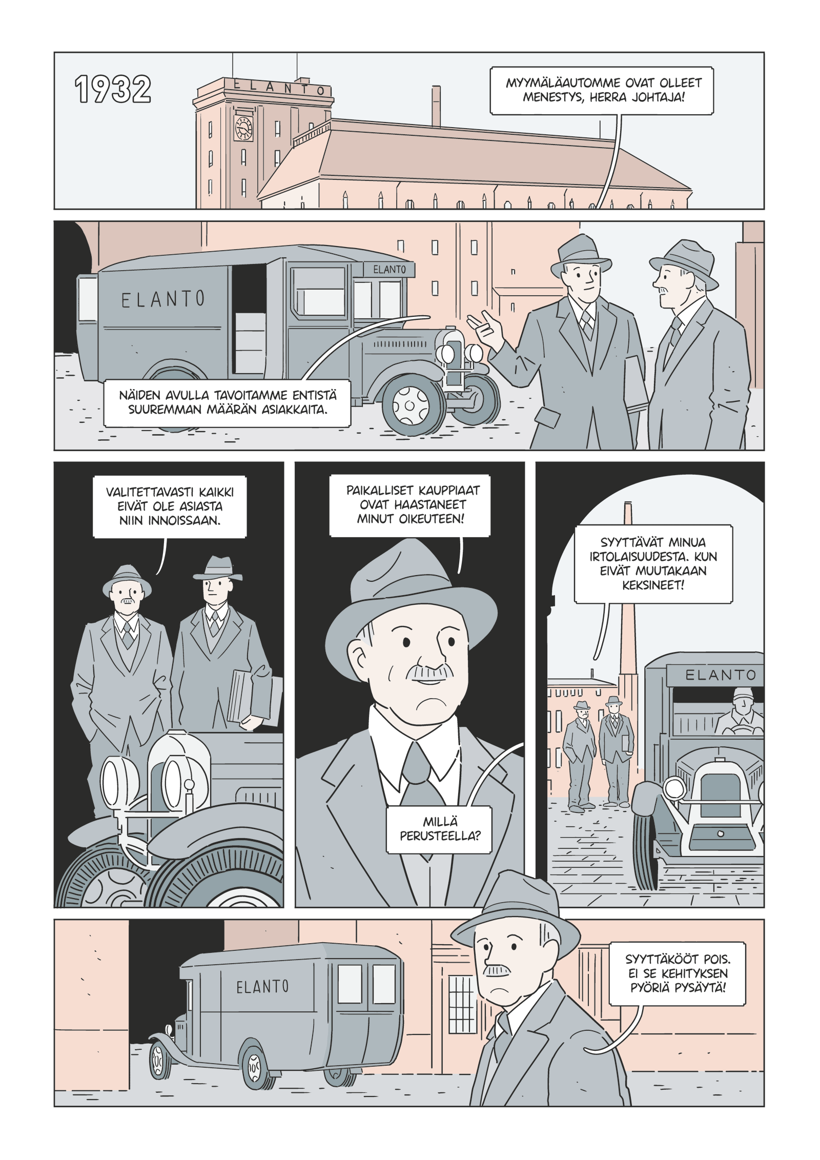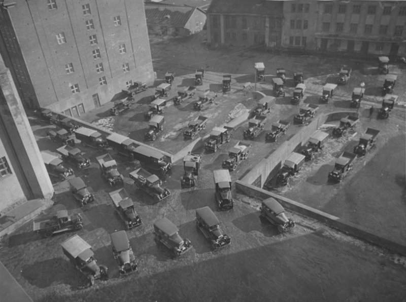 Osa Elannon autokannasta 1930-luvulla Elannon tuotantoalueen pihalla. Työväen Arkisto.