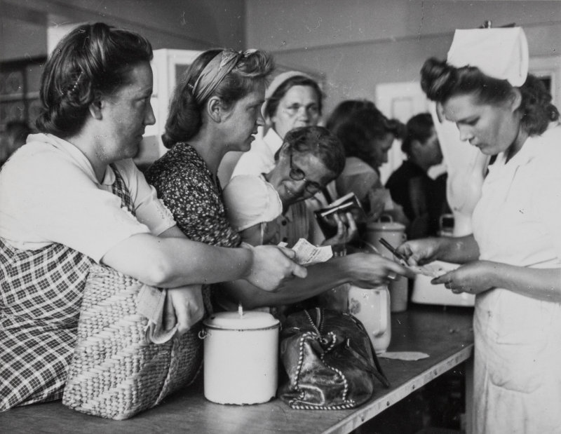 Kotitaloudet saivat ostaa tiettyjä elintarvikkeita rajatun määrän ostokorttia vastaan, jotta elintarvikkeiden riittävyys kaikille pystyttiin takaamaan. Säännöstelyn rinnalle syntyi myös laitonta kaupankäyntiä, ns. musta pörssi. Kuvassa käydään kauppaa ostokorteilla. Työväen Arkisto.