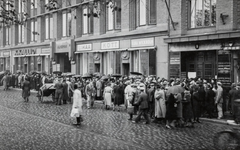 Elintarvikkeiden jonotuksesta tuli kansalle sotavuosina arkipäivää. Kuvassa jonotetaan Mikonkadulla välirauhan aikaan. Kuva: Valokuvaamo Kolmio, 7.10.1940. Työväen Arkisto.