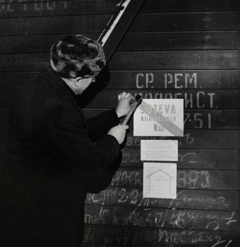 Osana Suomen ja Neuvostoliiton välistä rauhansopimusta Suomen tuli maksaa Neuvostoliitolle sotakorvauksia 300 miljoonan kultadollarin arvosta kuuden vuoden kuluessa (myöhemmin maksuaikaa hieman pidennettiin ja summaa alennettiin). Maksu suoritettiin tavarantoimituksilla, muun muassa puutavaralla ja metalliteollisuuden tuotteilla. Kuvassa on Suomesta Neuvostoliittoon lähtevän sotakorvausjunan vaunu, jonka oveen kiinnitetään näkyvää ilmoitusta sotakorvauksesta. Kuva: Photo Gunnari, 1950. Työväen Arkisto.