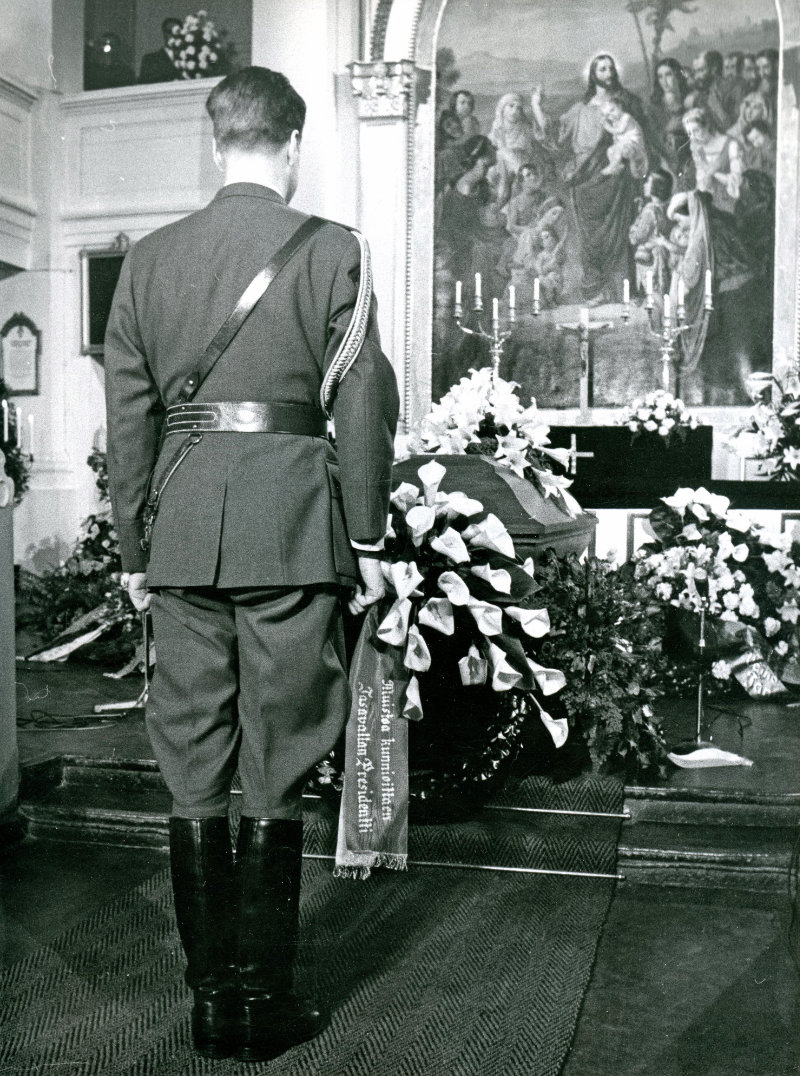 Väinön valtiolliset hautajaiset pidettiin Helsingin Vanhassa kirkossa 25.4.1966. Väinön ja Urho Kekkosen aiemmin sujuvat välit rikkoutuivat täysin toisen maailmansodan aikana pysyen Väinön kuolemaan saakka hyisinä. Kekkonen kykeni sodan päätyttyä kääntämään takkinsa ja myötäilemään Neuvostoliittoa, kun taas Väinö piti päänsä loppuun saakka ja oli muutoinkin Neuvostoliiton silmissä sotasyyllinen. Tasavallan presidentti Kekkonen ei osallistunut Väinön valtiollisiin hautajaisiin, vaan lähetti nuoremman adjutanttinsa, majuri Keijo Tuomisen, laskemaan seppeleen. Työväen Arkisto.