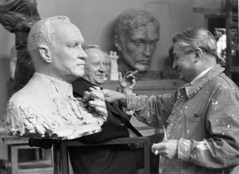 Kuvanveistäjä Wäinö Aaltonen työstää Väinön rintakuvaa. SDP:n puoluetoimikunta tilasi muotokuvan Väinön 70-vuotissyntymäpäivien kunniaksi, ja valmis teos paljastettiin Helsingin työväentalossa 15.3.1951. Työväen Arkisto.
