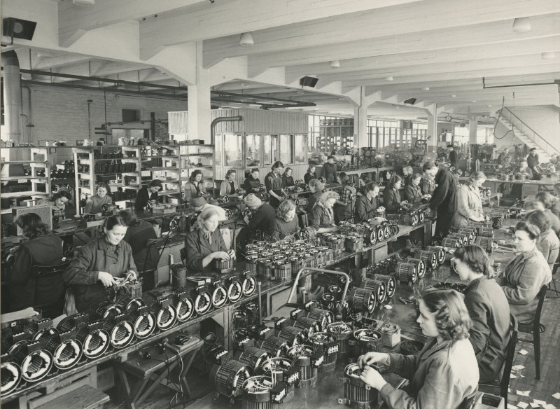 Strömbergin moottoritehtaan rakentamista Vaasaan 1940-luvulla vauhdittivat sotakorvaustoimitukset. Strömbergin urakkana oli toimittaa Neuvostoliittoon yli 25 000 sähkömoottoria. Kuvassa on käynnissä HZ-moottorien käämintä. Työväen Arkisto.