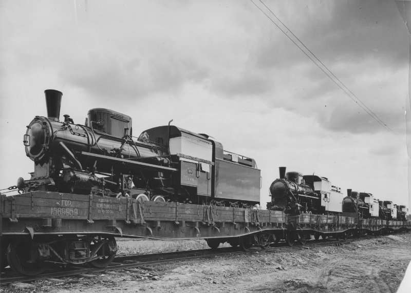 Junavetureita junan kyydissä. Veturit ovat olettavasti Tampella Oy:n valmistamia sotakorvausvetureita matkalla Neuvostoliittoon. Kuva: Staf Tampere 1960. Työväen Arkisto.
