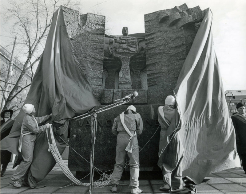 Helsingin Hämeentien ja Kaikukadun kulmassa, Väinö Tannerin kentän vieressä sijaitseva Kari Juvan veistämä Väinö Tannerin muistomerkki Tannerin portti paljastettiin 12.3.1985. Työväen Arkisto.
