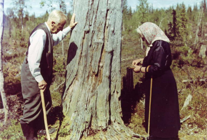 Väinö tutkailee kuusentainta Sorkissa. Kuvausaikaa ei tiedossa. Työväen Arkisto.