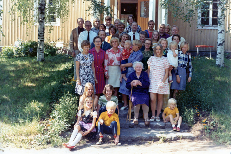 Linda perheineen Sorkissa 90-vuotispäivänään 24.6.1972. Linda eli 96-vuotiaaksi ja kuoli 12 vuotta Väinön jälkeen vuonna 1978. Työväen Arkisto.