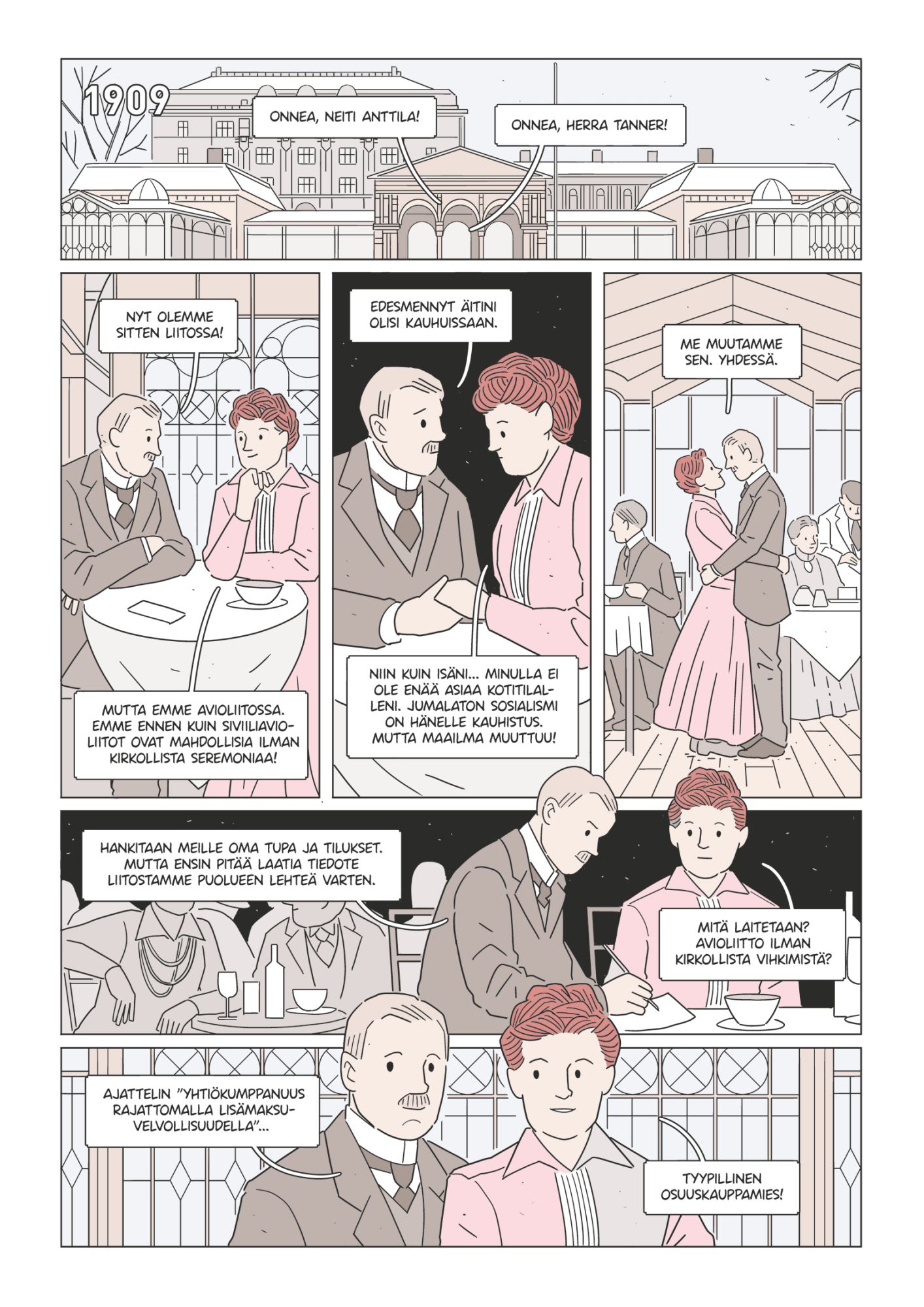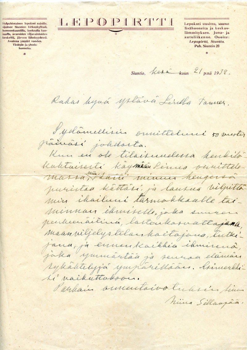Myös Miina Sillanpää onnittelee 50-vuotiasta Lindaa, “tarmokasta toiminnan ihmistä”. Sillanpää (1866-1952) oli merkittävä poliitikko ja yksi maamme pitkäaikaisimmista naiskansanedustajista, sosialidemokraattisen naisliikkeen johtohahmoja ja ensikotitoiminnan eteenpäin vievä voima. Väinön ollessa pääministerinä vuosina 1926-1927 valittiin Sillanpää Suomen ensimmäiseksi naisministeriksi. Kerrotaan, että valinnan takana oli Linda. Miina Sillanpään ja kansalaisvaikuttamisen päivän kunniaksi liputetaan 1.10. Työväen Arkisto.