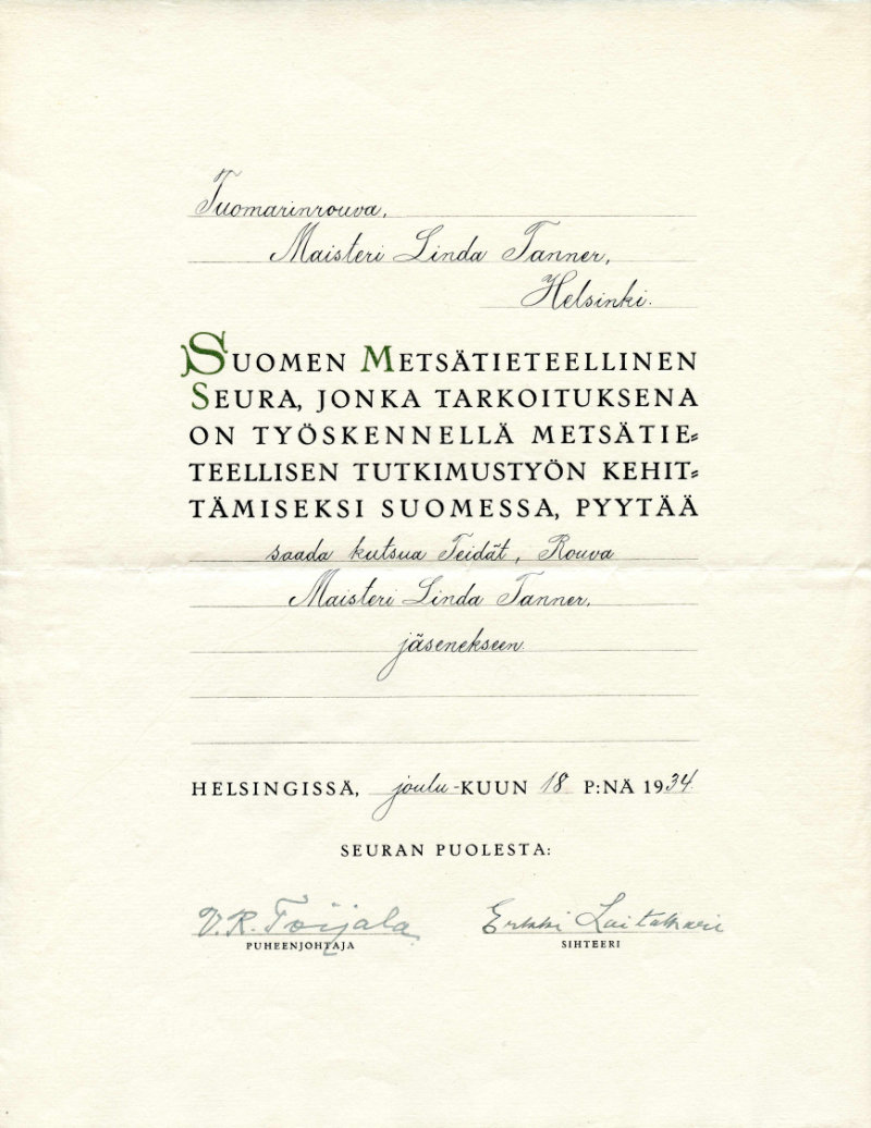 Suomen Metsätieteellinen Seura kutsui “tuomarinrouva, maisteri” Lindan jäsenekseen vuonna 1934. Seuraavana vuonna Linda piti biokemiallisen seuran kokouksessa esitelmän Metsähumuksen typpi biologisen humusteorian valossa. Työväen Arkisto.