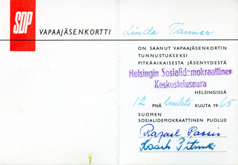 Lindalle myönnettiin Suomen Sosialidemokrtaattisen Puolueen vapaajäsenkortti vuonna 1965. Työväen Arkisto.